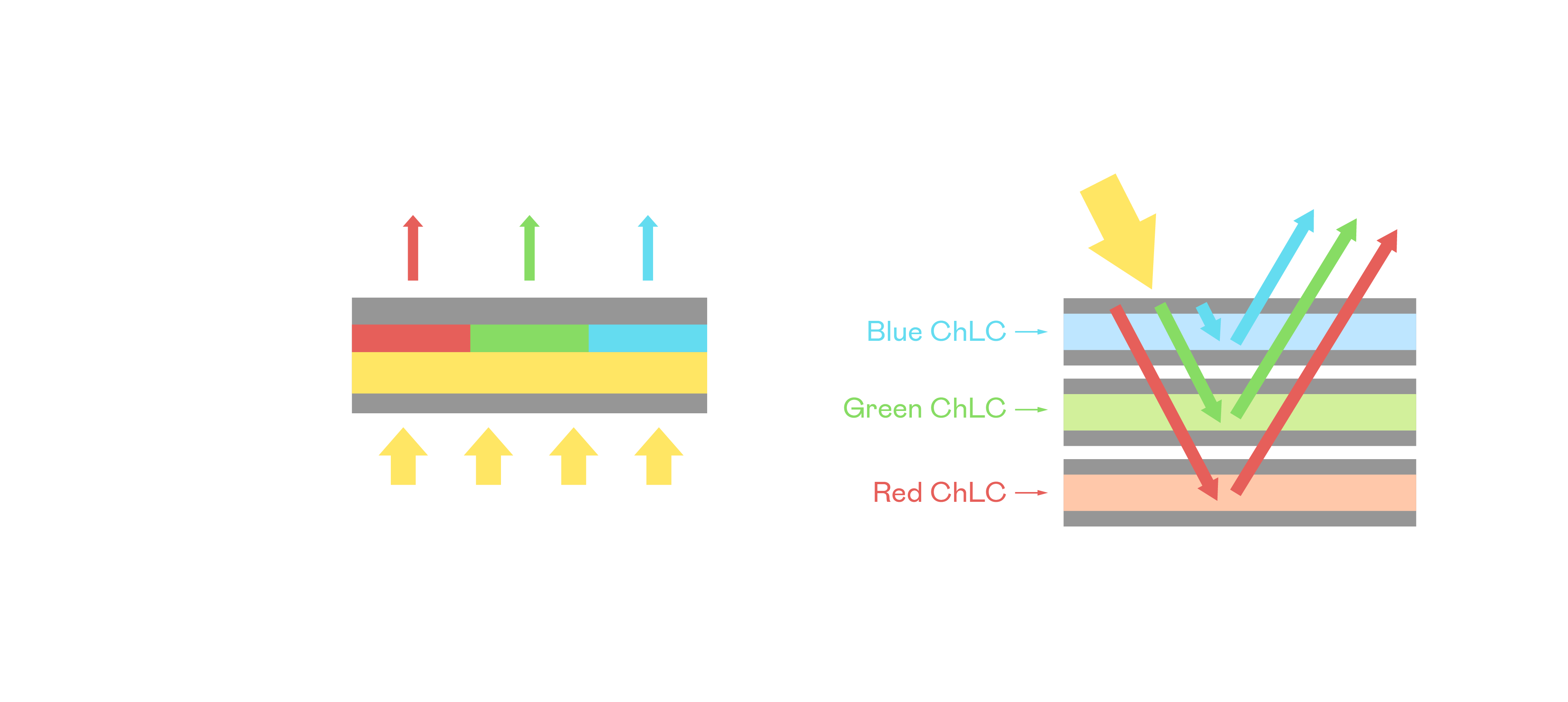 永利皇宫官网膽固醇液晶顯示器是由紅、綠、藍三層膽固醇液晶面板堆疊而成,並採用無彩色濾光片設計,減少環境光在反射過程中的損耗。